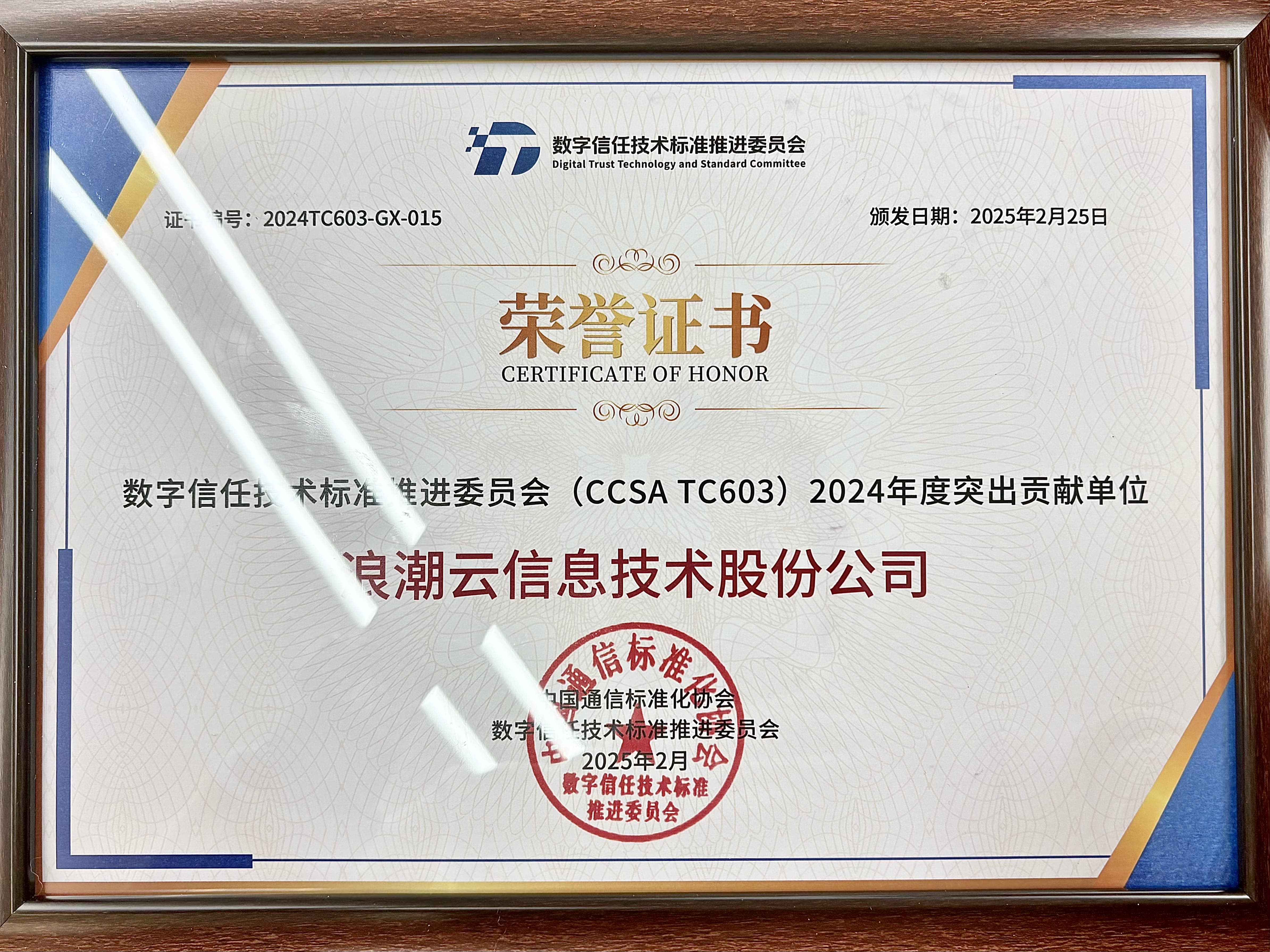 浪潮云荣获数字信任技术标准推进委员会(CCSA TC603)2024年度突出贡献单位